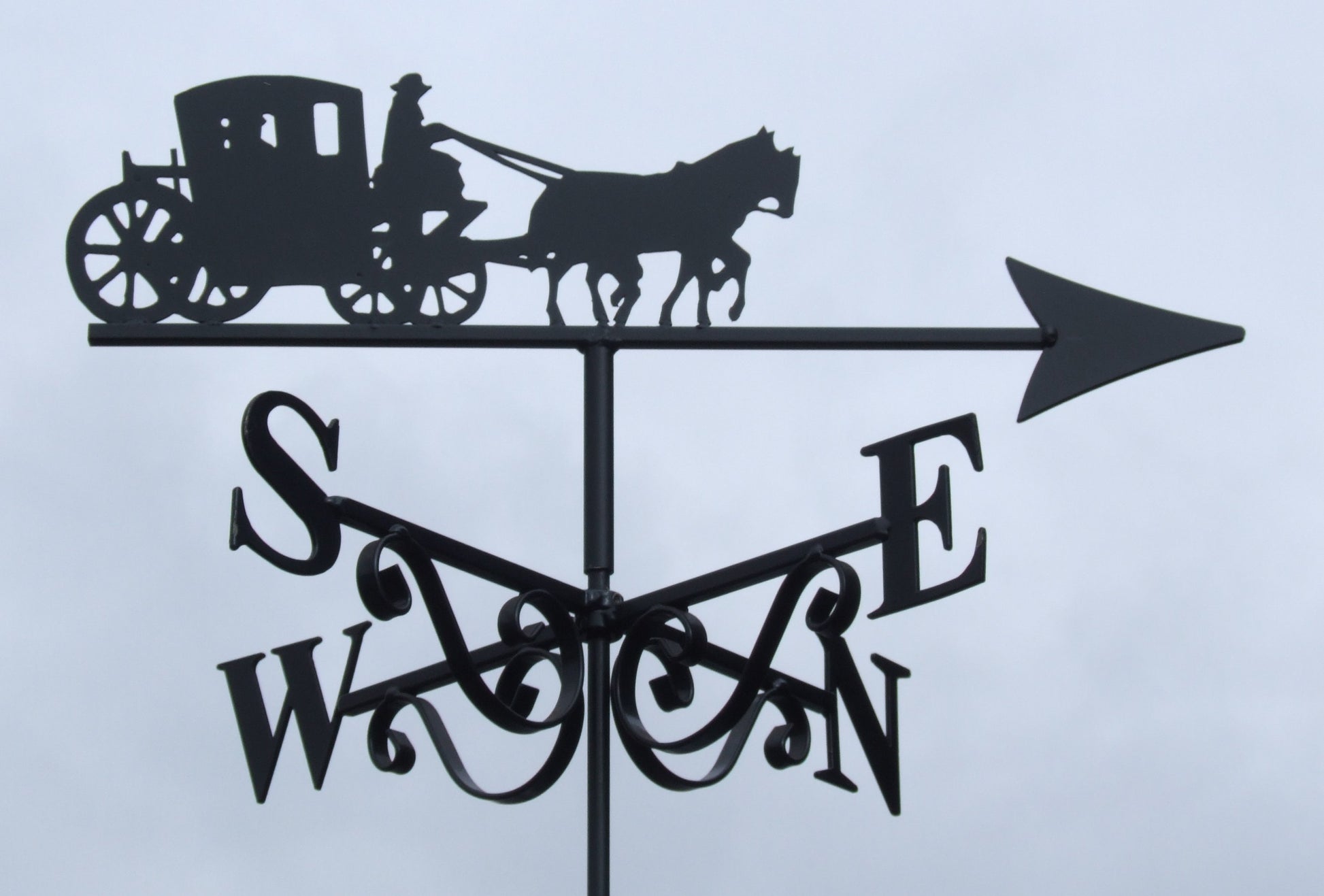 Measuring 40cm across the cardinal points N to S, this size is suitable for sheds, greenhouses pergolas, conservatories or small garages and outbuildings. Unlike our two larger sizes, Petite weathervanes have a single ended scroll.