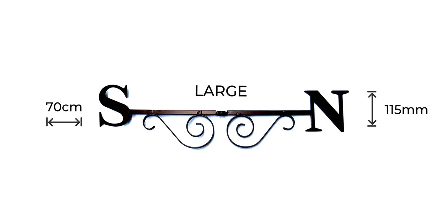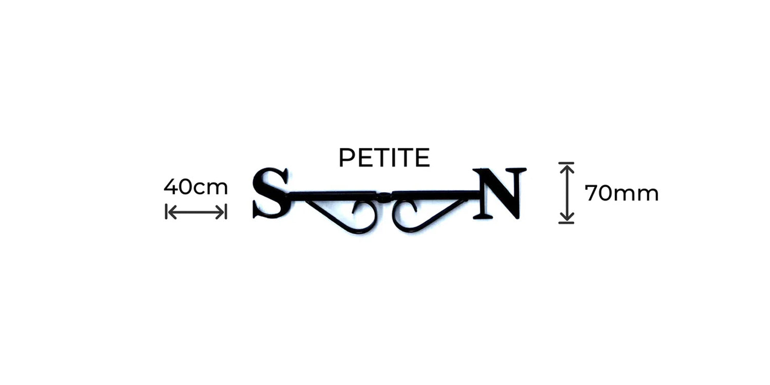 Measuring 40cm across the cardinal points N to S, this size is suitable for sheds, greenhouses pergolas, conservatories or small garages and outbuildings. Unlike our two larger sizes, Petite weathervanes have a single ended scroll.