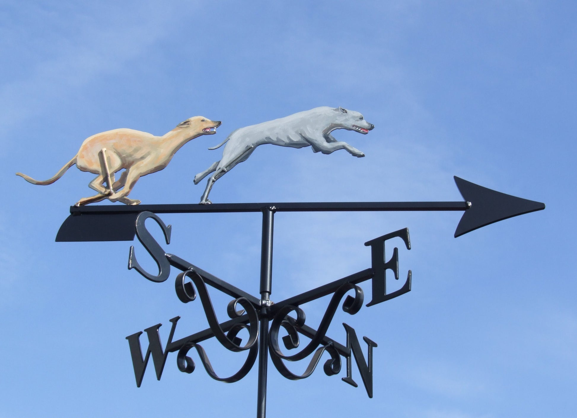 Measuring 40cm across the cardinal points N to S, this size is suitable for sheds, greenhouses pergolas, conservatories or small garages and outbuildings. Unlike our two larger sizes, Petite weathervanes have a single ended scroll.