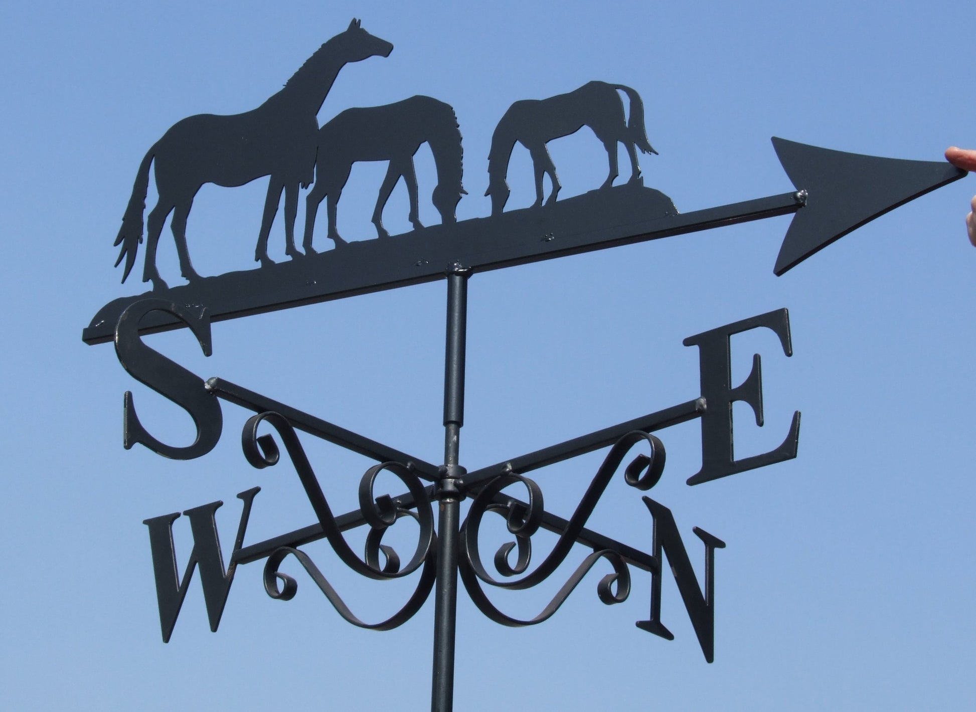 Measuring 40cm across the cardinal points N to S, this size is suitable for sheds, greenhouses pergolas, conservatories or small garages and outbuildings. Unlike our two larger sizes, Petite weathervanes have a single ended scroll.