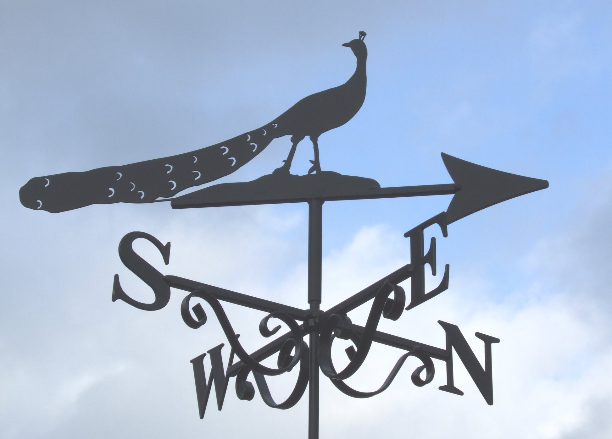 Measuring 40cm across the cardinal points N to S, this size is suitable for sheds, greenhouses pergolas, conservatories or small garages and outbuildings. Unlike our two larger sizes, Petite weathervanes have a single ended scroll.