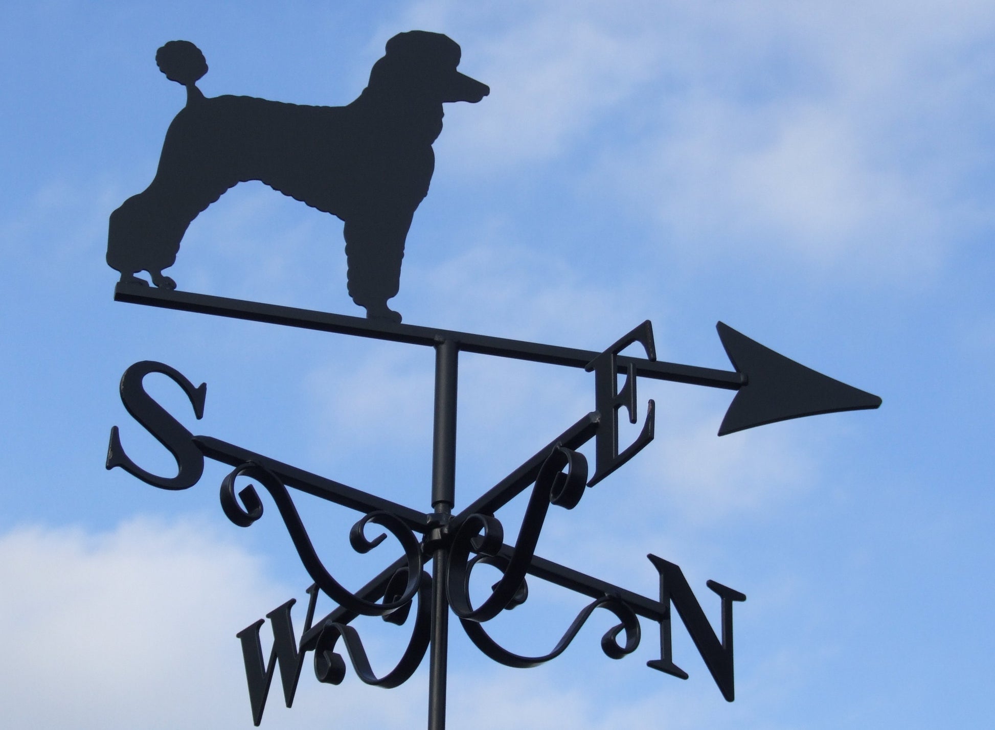 Measuring 40cm across the cardinal points N to S, this size is suitable for sheds, greenhouses pergolas, conservatories or small garages and outbuildings. Unlike our two larger sizes, Petite weathervanes have a single ended scroll.