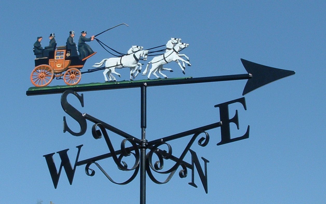 Measuring 40cm across the cardinal points N to S, this size is suitable for sheds, greenhouses pergolas, conservatories or small garages and outbuildings. Unlike our two larger sizes, Petite weathervanes have a single ended scroll.